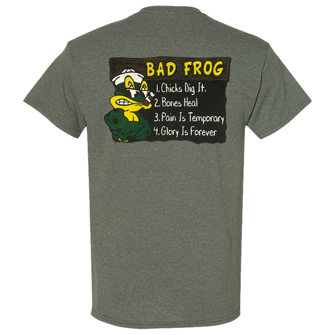 - Back Design: BAD FROG 1. Chicks Dig It 2. Bones Heal 3. Pain Is Temporary 4. Glory Is Forever with Freddy the Frog
