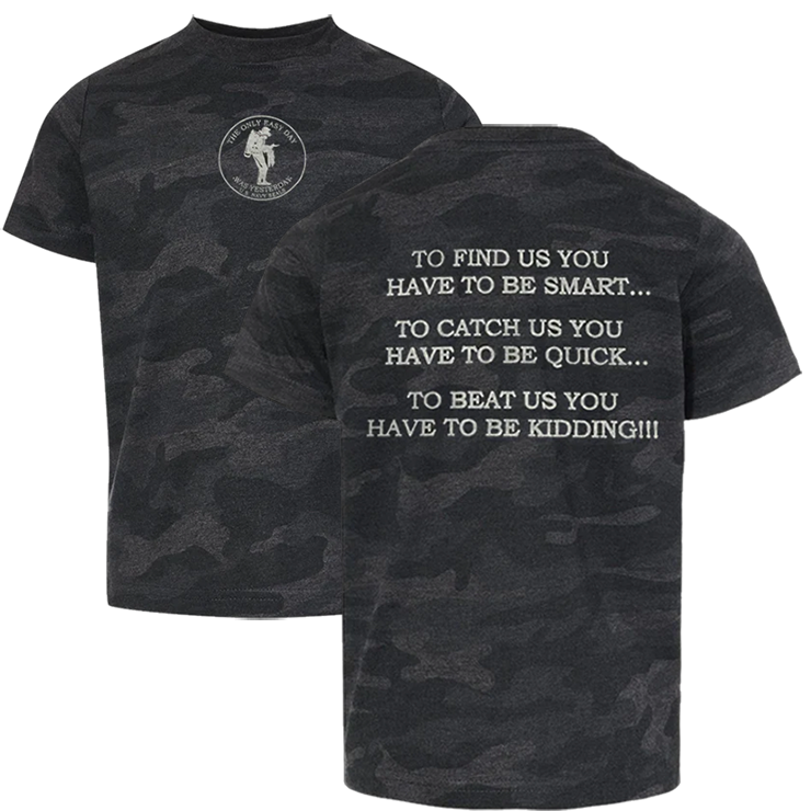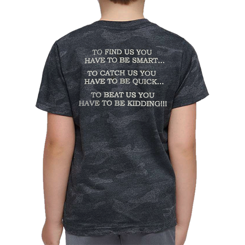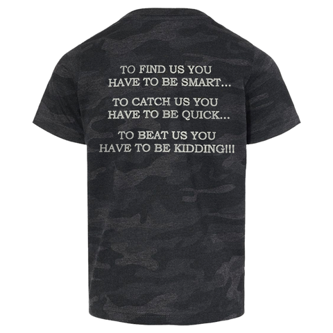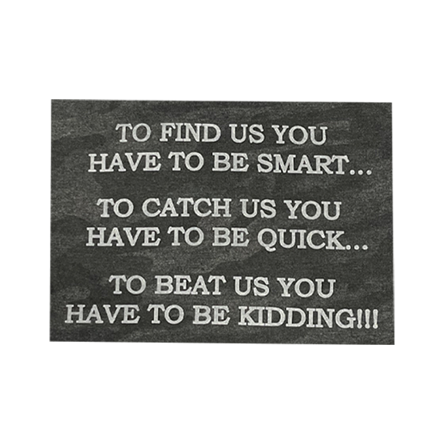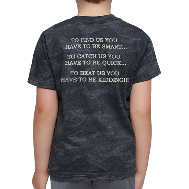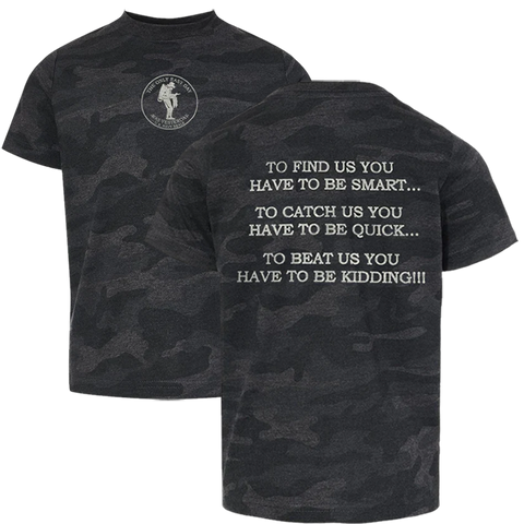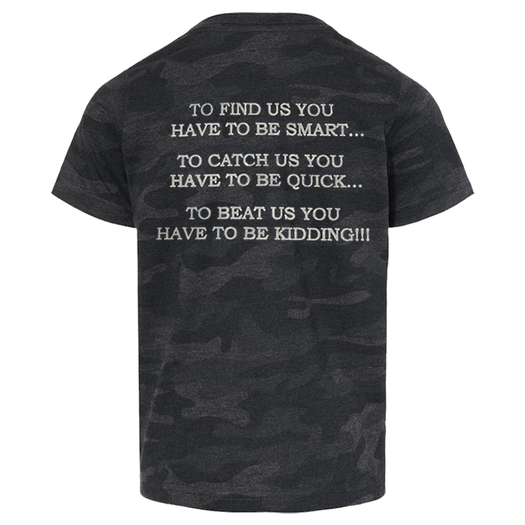 - Screenprint: To Find Us You Have to Be Smart... To Catch Us You Have To Be Quick... To Beat Us You Have To Be Kidding!!! (Gray Imprint) on the Back of T-shirt