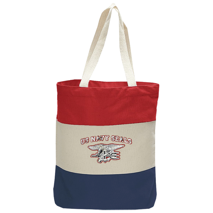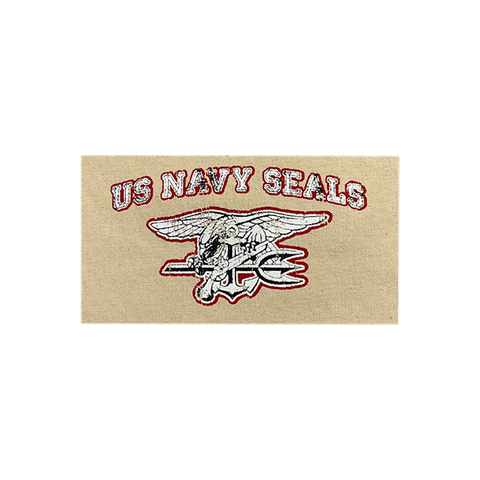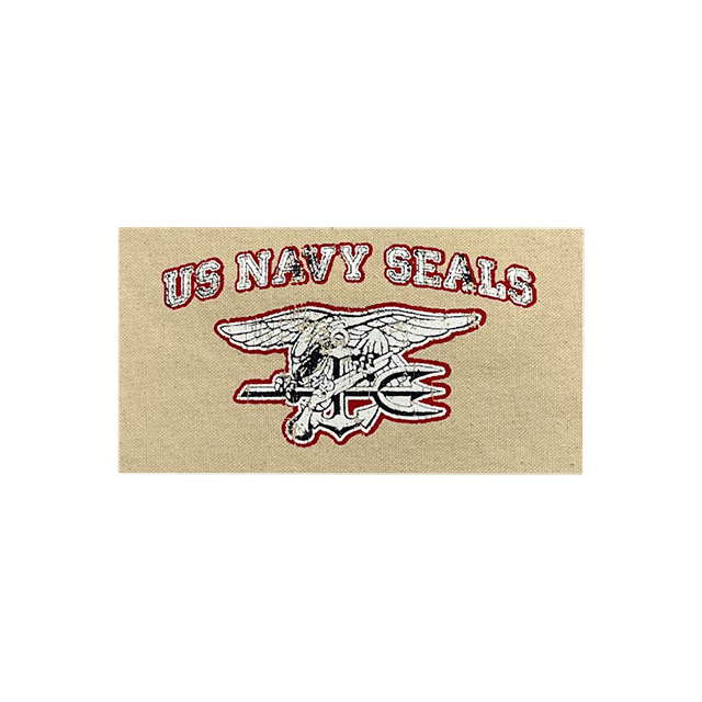- Screenprint: White and Blue US NAVY SEALS and Trident in Crackled Print with Red Outline on the Bag Center