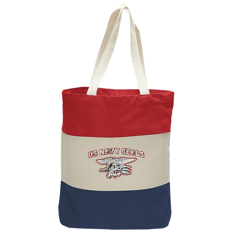 - Screenprint: White and Blue US NAVY SEALS and Trident in Crackled Print with Red Outline on the Bag Center