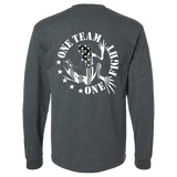 - Back Design: Gray/Black/White Patriotic Bone Frog Surrounded by ONE TEAM ONE FIGHT and Stars Circling the Bone Frog